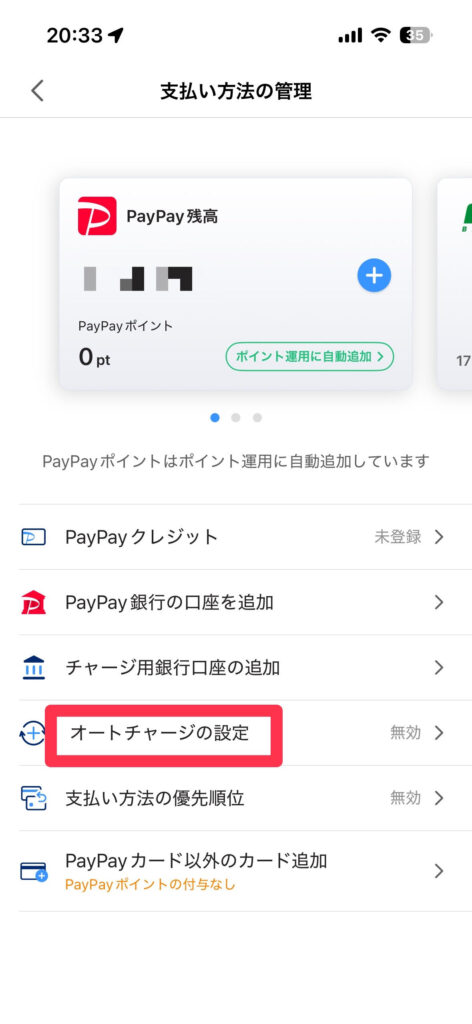 PayPayアプリの「アカウント」>「支払い方法の管理」から、オートチャージが設定されていないかチェックしましょう。